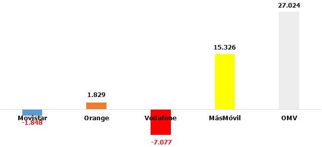 MásMóvil empieza a ser “terrenal”, retrocediendo ante unas OMV fortísimas. Movistar y Orange, casi planas, aunque en negativo. El farolillo rojo es para Vodafone: -4% interanual: