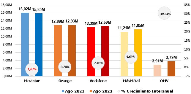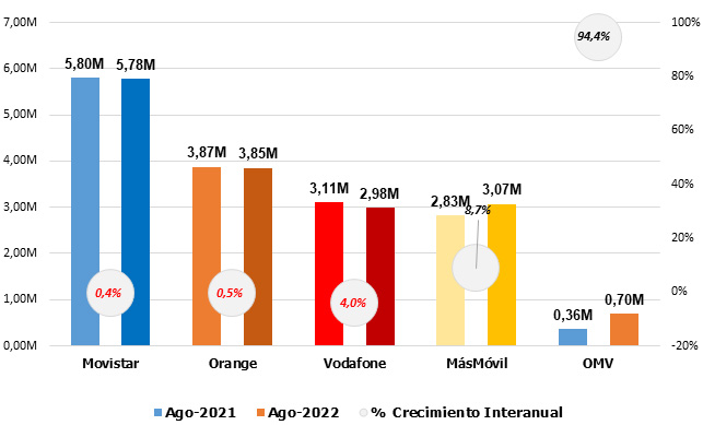 De nuevo, todas las operadoras saldan en positivo, aunque en este caso – y a diferencia de julio- las OMV y Vodafone superan a MásMóvil. Buen comportamiento de Movistar y retroceso de Orange: