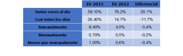 La frecuencia de uso sí demuestra un constante incremento, aunque la estadística comienza a quedarse anticuada: se necesita una concreción en el valor de “varias veces al día” para comprobar si dicha intensidad realmente aumenta: