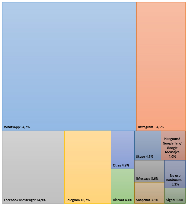 La métrica de mensajería instantánea también resulta de interés. El poderío indiscutible de WhatsApp se refuerza con el segundo puesto de Instagram y el tercero de Facebook Messenger, todas propiedad de Facebook-Meta. Telegram, a pesar de sus aspiraciones, no opta ni al pódium y aparece Discord, muy empleada por la juventud como un valor al alza: