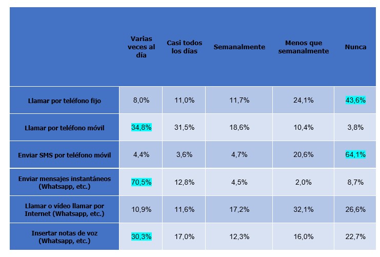 Finalmente, traemos a colación como han cambiado los hábitos de consumo de los clientes de servicios de telecomunicaciones. Un 43% ya no llama nunca por teléfono fijo y un 64% ya nunca envía SMS. Los reyes de la comunicación son los mensajes por WhatsApp (70,5%), llamar por teléfono móvil (35%) y enviar notas de voz por WhatsApp (30%)