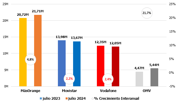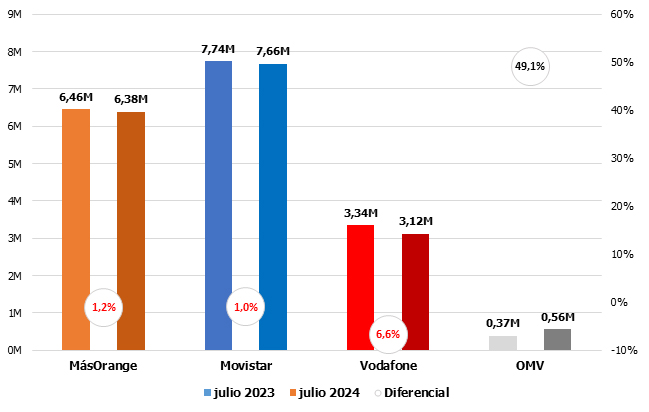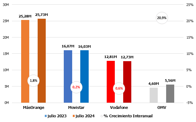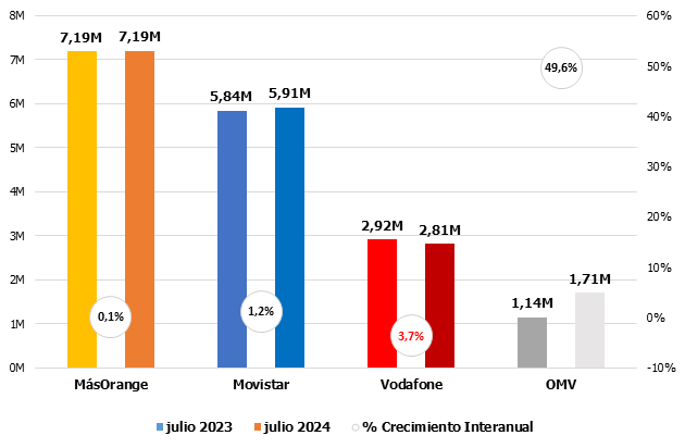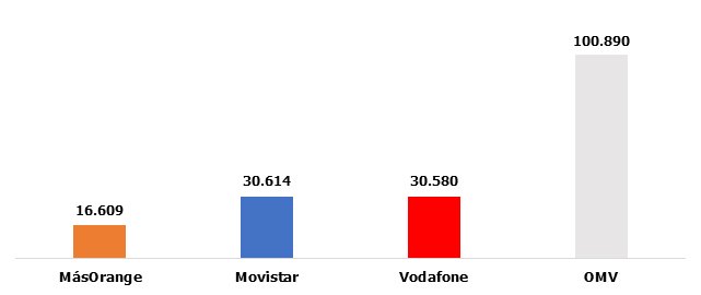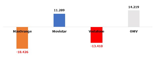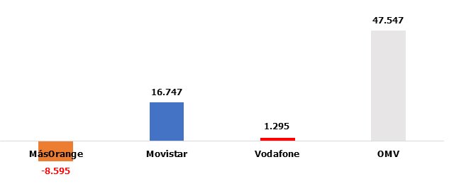 Aquí sí que MásOrange demuestra una fortaleza insoslayable, que triplica las pérdidas de Vodafone y Movistar: