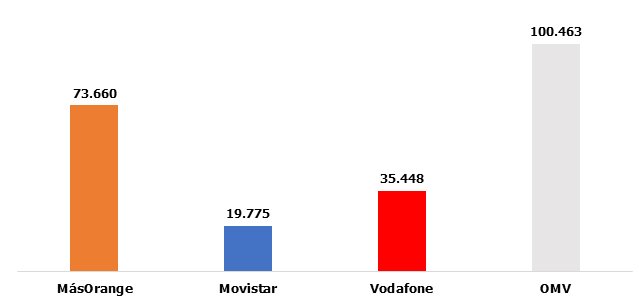 Como en la BAM, todos aumentan parque. La diferencia es MásOrange, que en este caso sí se muestra fuerte, hasta el punto de amenazar el liderato de las OMV.