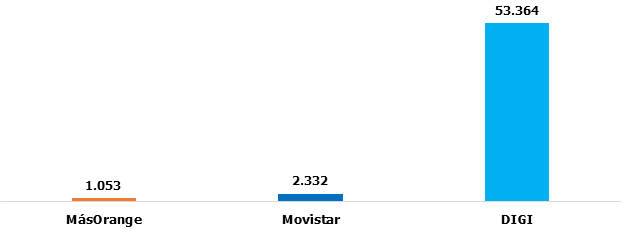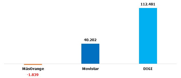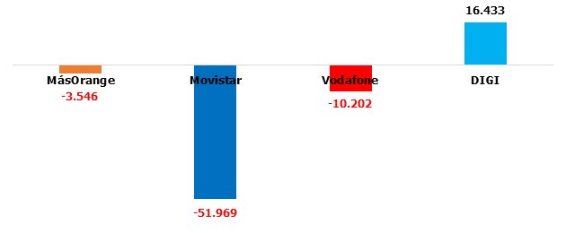 Imbatible DIGI, notable Movistar, suspenso para MásOrange. De nuevo excluimos a Vodafone (-451.254 líneas de Finetwork) y las OMV por las circunstancias antes explicadas: