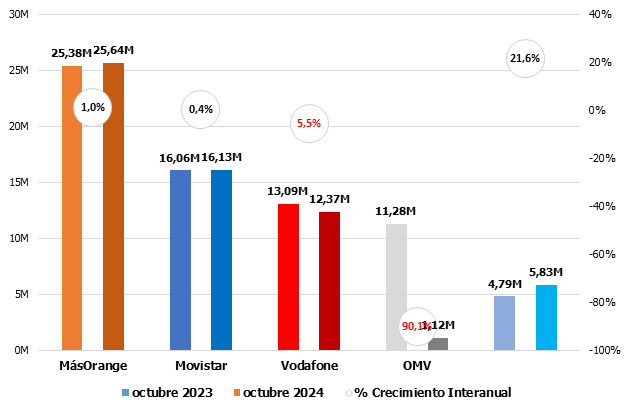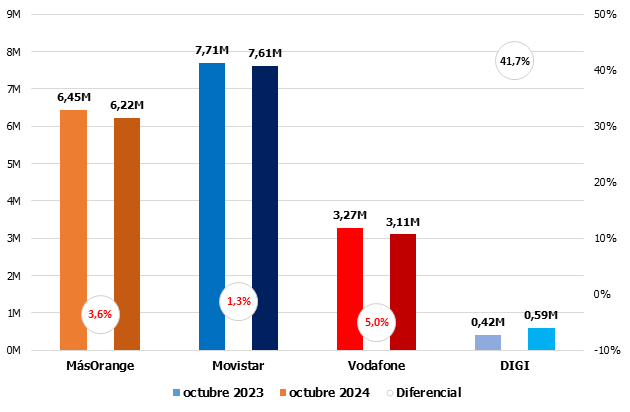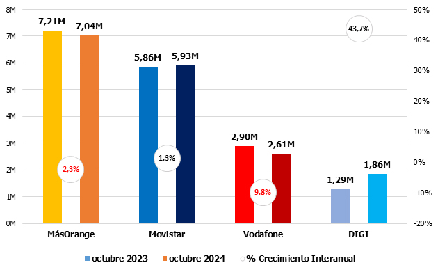 Si meses anteriores O+ era la decepción, en octubre lo fue Movistar. La única en positivo, DIGI.