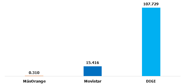 Aquí podemos comprobar el ritmo de crecimiento de DIG: más de un 43% en un solo año. La crisis de MásOrange se acentúa, mientras Movistar mantiene el tipo. De nuevo, hay que considerar los datos de Vodafone bajo la lupa del efecto de Finetwork.