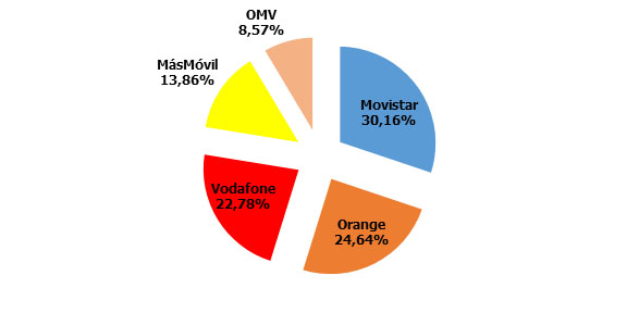 El cuotas de mercado, el bajo volumen casi no cambia nada: MásMóvil se acerca 11% de cuota y el diferencial entre Vodafone y Orange se reduce cada vez más: 4,5%:
