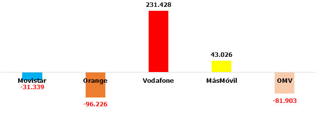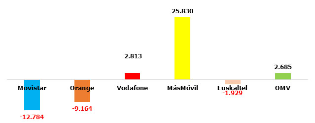 A pesar de que el mes fuese inhábil para portabilidades, el panorama no difere en mucho de meses anteriores: MásMóvil logra 26.000 altas netas, a costa de una Orange que sigue en caída libre (-9.000) y de Movistar, que pierde casi 13.000 accesos. Vodafone repite en positivo, mientras que las OMV crecen al mismo ritmo que la marca roja: +2.500 accesos: