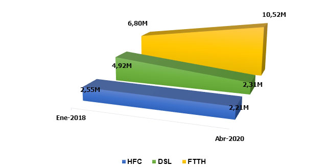 Una sección que repite tendencia mes tras mes, a la espera de que el ADSL pierda el segundo puesto ante el cable, hecho que no tardará en producirse: