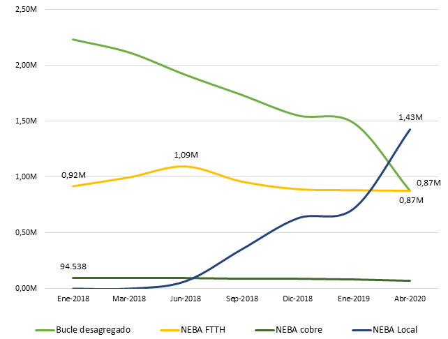 Otra sección que reitera tendencias, a la espera de un futuro sorpasso: el del NEBA cobre por el NEBA FTTH, que se encuentra en empate técnico: