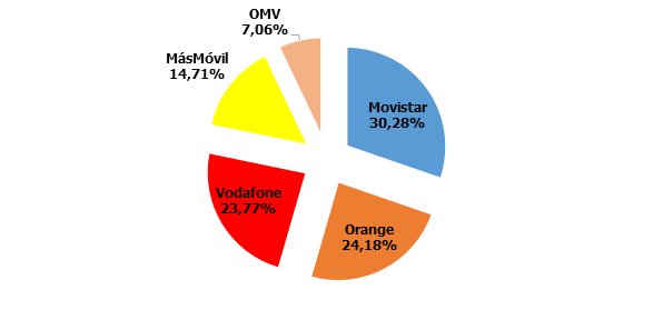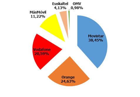 MásMovil supera al fin el 11% de cuota de mercado, mientras que la diferencia entre Vodafone y Orange continúa en el 4% a favor de la segunda. Las OMV rozan el 1%: