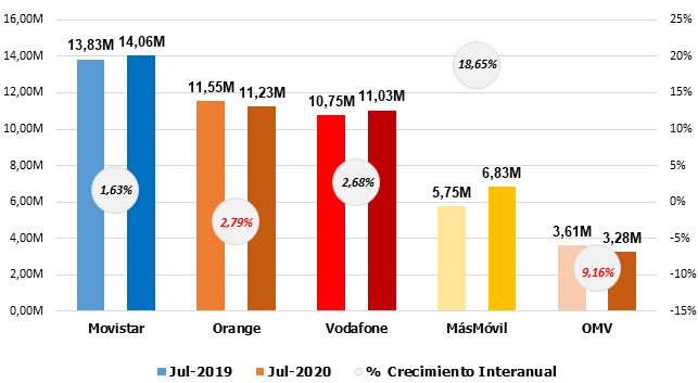 Después del astronómico crecimiento de junio (1.371.478 altas netas), julio nos depara otras 352.000 altas netas, que se reparten entre MásMóvil (253.000), OMV (96.000), Orange (91.500) y Movistar (44.400). La única operadora que pierde clientes es Vodafone: -132.000.