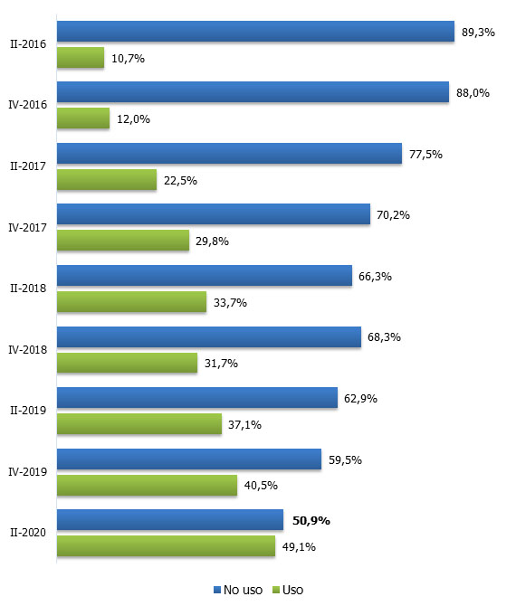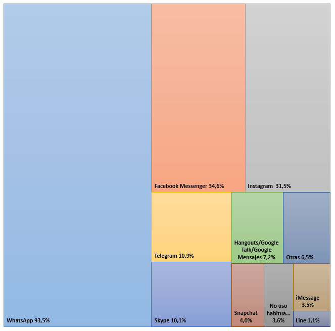 De forma coherente, los servicios de mensajería online también registran notables incrementos. Whatsapp sube hasta un 93,5% de uso, seguido de Facebook Messenger que alcanza el 34,6% (12 puntos porcentuales –pp- más que seis meses antes). Instagram (nótese que las tres empresas tiene en mismo dueño) incrementa su aceptación en 11 pp. Telegram, a pesar de las campañas por fomentar su uso crece moderadamente (+2,5 pp) y Skype dobla su uso, del 5 al 10%. El número de personas que declaran no usar estas aplicaciones descendiente a la mitad: