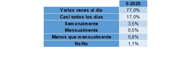 La frecuencia de acceso a Internet también se ve alterada: el uso permanente, de varias veces al día se incrementa y las personas que se conectan diariamente suben hasta el 94%, su mayor guarismo desde que se tiene datos.