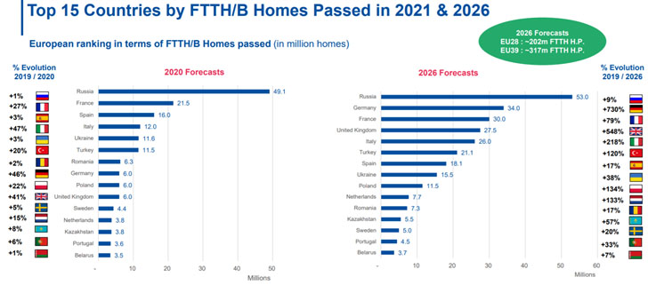 Si en 2020 se espera que España finalice en segunda posición, con una penetración en los hogares del 62,3%, este porcentaje aumentaría al 83,2% en 2026. En la evolución comparada, se observa como Bielorrusa, primera en 2020, cae al quinto puesto, mientras que Francia presenta una evolución asombrosa: del 35% de 2020 al 92%, lo que la aúpa al primer puesto. Sin duda, las políticas de impulso del regulador sectorial francés (ARCEP) y la fortísima competencia entre los cuatro operadores implicados (Orange, Free, SFR y Bouygues), avalan esta predicción.