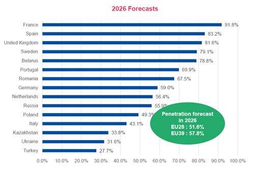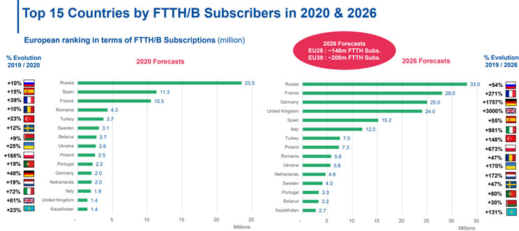 Si en 2020 se espera que España finalice en segunda posición, con una penetración en los hogares del 62,3%, este porcentaje aumentaría al 83,2% en 2026. En la evolución comparada, se observa como Bielorrusa, primera en 2020, cae al quinto puesto, mientras que Francia presenta una evolución asombrosa: del 35% de 2020 al 92%, lo que la aúpa al primer puesto. Sin duda, las políticas de impulso del regulador sectorial francés (ARCEP) y la fortísima competencia entre los cuatro operadores implicados (Orange, Free, SFR y Bouygues), avalan esta predicción.