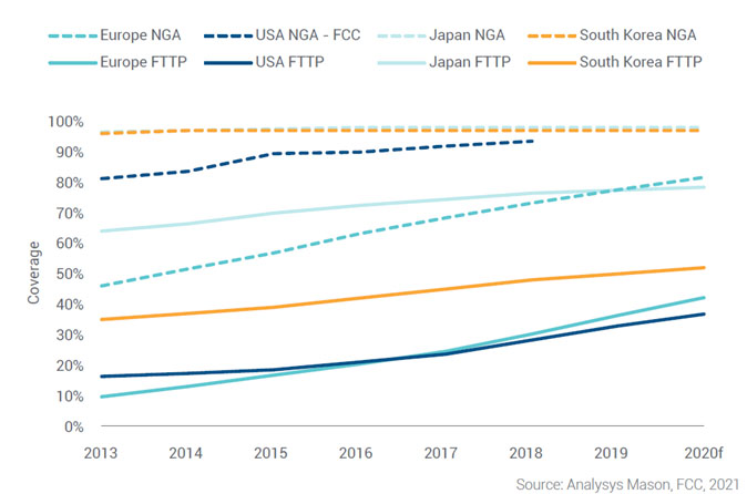 Cobertura NGA y FTTP, Europa, EE. UU., Japón y Corea del Sur, 2013 – 2020f