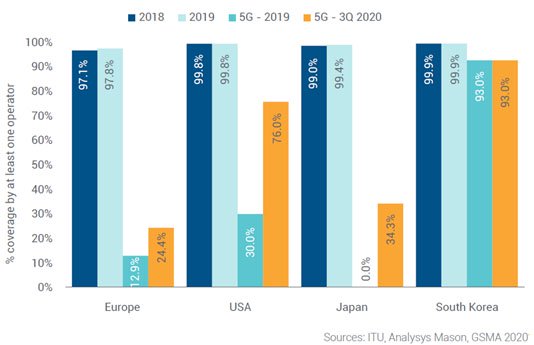 Porcentaje de la población cubierta por al menos un operador de telefonía móvil LTE. Europa, Corea del Sur, Japón y EE. UU., 2018, 2019, más al menos un operador 5G, 3T 2020