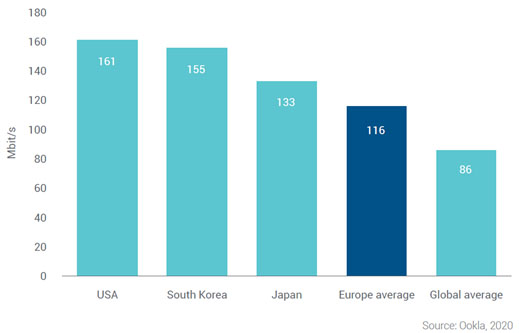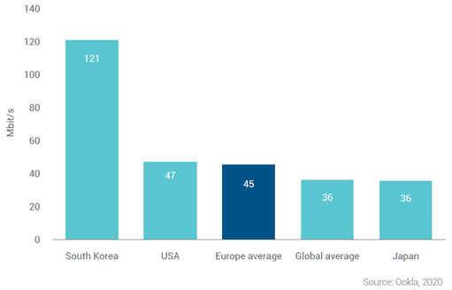 Velocidad media conexión fija, sentido descendente. Europa, EE. UU., Japón y Corea del Sur, septiembre de 2020