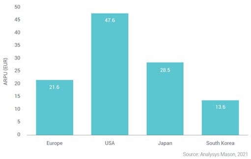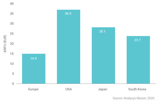 ARPU móvil (excluidas las SIM de IoT). Europa, Estados Unidos, Japón, Corea del Sur, 2019
