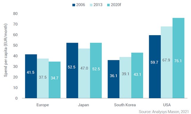 Gasto medio per cápita en telecomunicaciones. Europa, Estados Unidos, Japón y Corea del Sur, 2006, 2013 y 2020f