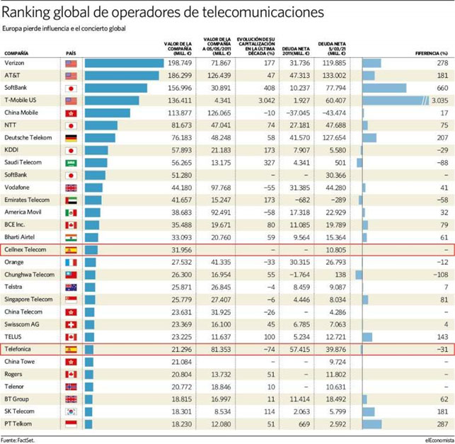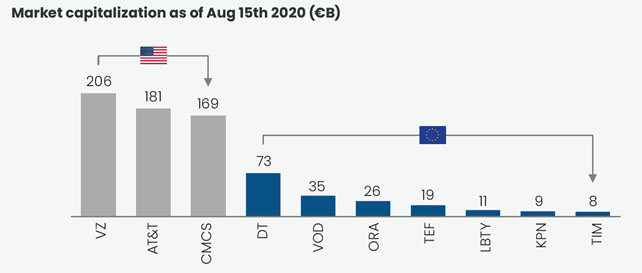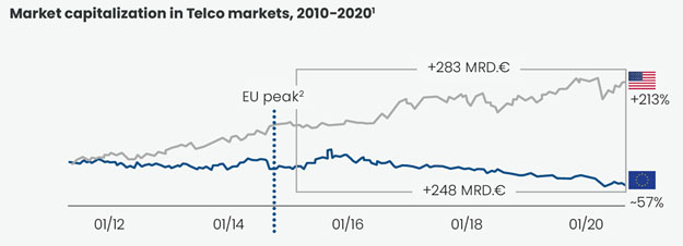 Para dar una visual, pero certera visión del retraso europeo en telecomunicaciones en comparación con el del resto del mundo, hemos compilado una serie de gráficos publicados recientemente por la patronal de los operadores incumbentes europea, ETNO. En concreto, en sus informes The State of Digital Communications 20216https://etno.eu/library/reports/95-state-of-digi-2021.html y Connectivity and Beyond: How Telcos Can Accelerate a Digital Future For All7https://etno.eu/news/all-news/704-etno-bcg.html; acabaremos dicho recopilatorio con imágenes extraídas de los diarios Expansión8https://www.expansion.com/empresas/tecnologia/2021/04/02/60663a08e5fdeaff708b45cc.html y El Economista9https://www.eleconomista.es/empresas-finanzas/noticias/11194636/05/21/-Las-telecos-americanas-y-asiaticas-agigantan-su-brecha-con-las-europeas.html, que resume a la perfección la comparativa Europa vs. EEUU.