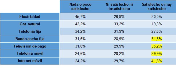 Como en todos los análisis precedentes, la encuesta se centra en la valoración subjetiva que hacen los consumidores sobre servicios tradicionales como energía (electricidad, gas natural) y telecomunicaciones (banda ancha, Internet móvil, telefonía fija y móvil y TV de pago).