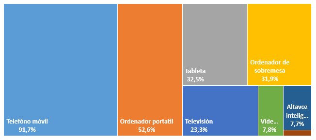 En cuanto a los dispositivos usados para conformar tal conectividad, se confirma al teléfono móvil como el medio preferido, seguido del portátil, aunque desciende a favor de la TV, que aumenta tres puntos: