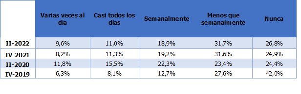 Finalizamos este resumen con un tema que ya hemos tratado en análisis anteriores: las videollamadas. Se observa un leve repunte de su uso más intenso, pero a la par, que aumenta el número de personas que nunca las usa: