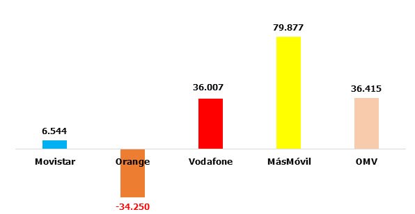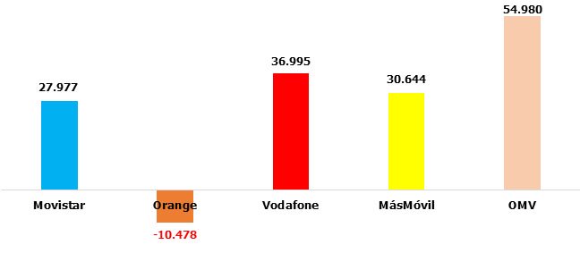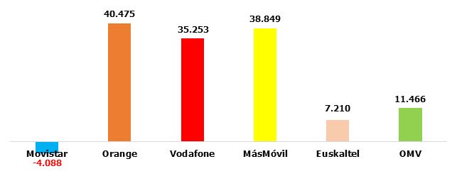 La relación contractual entre BAF y telefonía vocal golpea a Orange (-34.000), cuestión que aprovecha MásMóvil con un gran beneficio: +80.000. Entre medias, bien las OMV y Vodafone y mediocre Movistar: