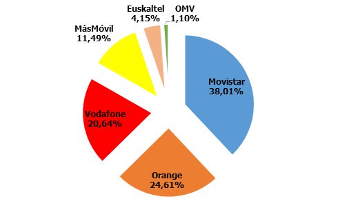 En esta ocasión las coutas de mercado si se muestran cierto movimiento. Movistar está a punto de perder el 38%, MásMóvil avanza hacia el 12% y Euskatel y las OMV consolidan sus guarismos (4% y 1%):