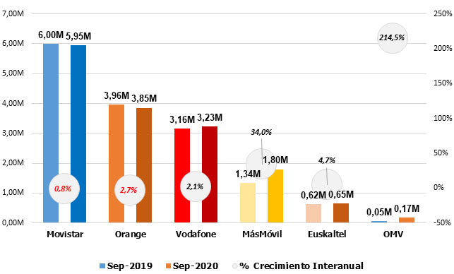 Continúan solo dos operadores en tendencia positiva: obviamente, MásMóvil, que ya supera el +30% interanual; le acompaña Movistar, con un +0,8%, pero mejora incluso con respecto a agosto. El resto de operadores, en negativo: