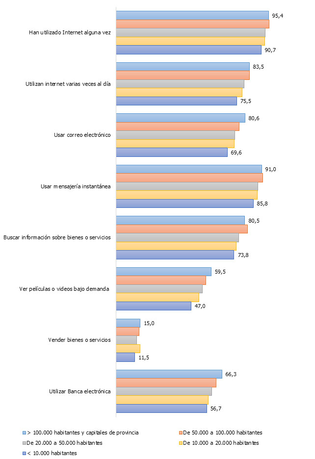 No es mejor la situación de los conciudadanos que viven en las poblaciones más pequeñas, en la denominada España vaciada. En todos los indicadores comparables, cuanto más pequeña es población, peor es el índice de conectividad a Internet (-5% comparando una población de menos de 10.000 habitantes con una de mas de 100.000), la frecuencia de uso de la web (-8%), del mail (-11%) o del WhatsApp (-5,2%) e incluso la posibilidad de ver películas online (-12,5%) o manejarse con la banca electrónica (-9,6%; se anexa gráfica ilustrativa al final del documento). Sin duda, las deficientes infraestructuras de telecomunicaciones existentes en el rural, pero en gran medida la ausencia de formación digital, explican estos elevadísimos diferenciales. Carencias que se han exacerbado con la pandemia Covid19, donde la posibilidad de teletrabajar, de poder recibir una adecuada educación a distancia y tener a disposición una alternativa de ocio online, marcaban la diferencia