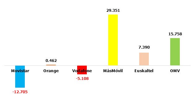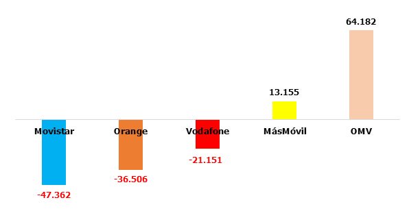 Horrible mes para Movistar y Orange, que bien aprovechado por las OMV, con 58.000 altas netas. Sorprende la moderación de MásMóvil, con ganancia mucho menores a las acostumbradas.