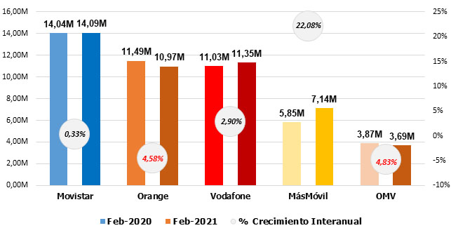 MásMóvil lidera con idénticas ganancias que en enero, con una Euskatel que confirma su buena racha. Movistar, aunque aminora pérdidas, continúa en caída. Vodafone reitera números rojos.