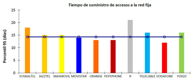 Tiempo de suministro de acceso a la red fija: Se define como el tiempo que transcurre desde el instante en que el operador recibe una solicitud válida de suministro del servicio telefónico hasta el instante en el que el servicio se encuentra activado y disponible para su uso. Se facilita la medición del tiempo máximo para el 95% de las solicitudes de clientes residenciales con menores tiempos de suministro (percentil 95). Su medición se realiza a partir de los datos de todas las solicitudes de suministro realizadas en el trimestre.