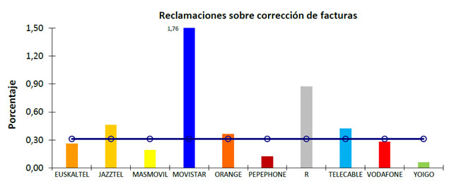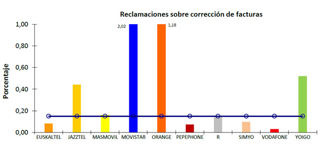 Reclamaciones sobre corrección de facturas: Relación entre las facturas que han sido objeto de reclamación sobre su contenido, realizadas por los clientes residenciales, relativas al servicio telefónico y/o al servicio de acceso a Internet y el número total de facturas emitidas a estos clientes. Su medida se realiza contabilizando el número de facturas reclamadas por algún aspecto relativo a su contenido durante el trimestre y se expresa en porcentaje. Se efectúan mediciones separadas de este parámetro para el servicio fijo y el servicio móvil.