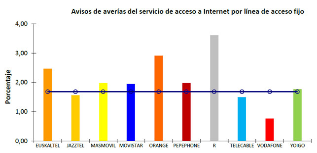 Porcentaje de avisos de avería por línea de acceso fijo del servicio telefónico fijo y servicio de acceso a Internet: Se define como la relación entre los avisos válidos de avería comunicados por los clientes residenciales sobre posibles averías en la red de acceso del operador y el número medio de líneas en servicio. El número medio de líneas en servicio es obtenido a partir de las líneas sobre las que se presta el servicio telefónico o el servicio de acceso a Internet, tanto si éste es el único servicio suministrado, como si sobre la línea se proporcionan otros servicios. Los avisos de avería contabilizados son los referidos al servicio telefónico fijo o al servicio de acceso a Internet. Su medición se realiza contabilizando todos los avisos válidos de avería recibidos durante el trimestre y el resultado se expresa como un porcentaje. Se mide y publica desagregado para el servicio telefónico fijo y para el servicio de acceso a Internet fijo.