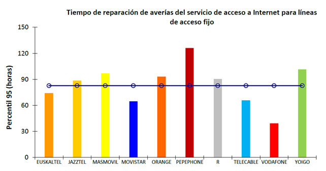 Tiempo de reparación de averías para líneas de acceso fijo del servicio telefónico fijo y servicio de acceso a Internet: Se define como el tiempo transcurrido desde el instante en el que se ha notificado por el cliente un aviso de avería hasta el momento en que el elemento del servicio, o servicios, se ha restablecido a su normal funcionamiento. Se contemplan las siguientes mediciones: