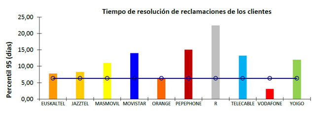 Tiempo de resolución de reclamaciones de los clientes: Se define como el tiempo transcurrido entre la presentación por parte de un cliente residencial de una reclamación relativa al servicio telefónico y/o al servicio de acceso a Internet y la resolución por el operador de dicha reclamación. Su medición se realiza a partir de los datos de todas las reclamaciones resueltas durante el trimestre. Se ordenan de menor a mayor tiempo de resolución y se toma el registro correspondiente al 95 % de todas las reclamaciones. El valor de este registro (percentil 95) es el valor que publica el operador. Se efectúan mediciones separadas de este parámetro para el servicio fijo y el servicio móvil.