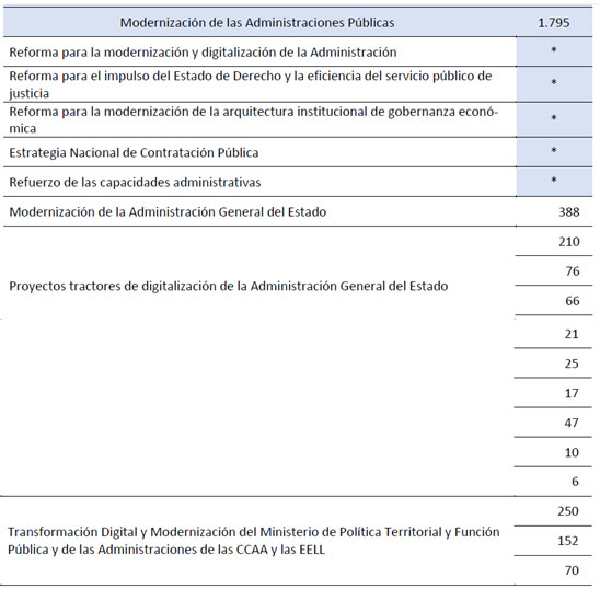 Y por supuesto, la fuerte inversión para la necesaria Modernización de las Administraciones Públicas7https://administracionelectronica.gob.es/pae_Home/pae_Estrategias/Estrategia-TIC/Plan-Digitalizacion-AAPP.html, que frisa los 1.800 millones de euros: