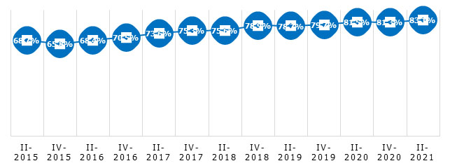 Los últimos datos del Panel de Hogares de la CNMC2https://www.cnmc.es/node/391169 ahondan en esta tendencia. Así, el número de personas que usan Internet ha pasado de un 85% sobre la población total a finales de 2019 al actual 88%. Hace escasamente un lustro, en el mismo trimestre de 2016, no se alcanzaba el 79%.