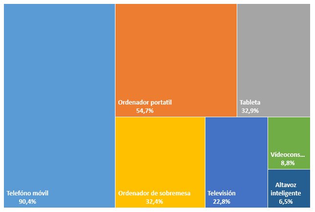Este aumento del uso y frecuencia está relacionado con el uso del teléfono móvil. Un 83% de la ciudadanía española usa una conexión móvil de contrato para acceder a Internet y hasta un 88% de los españoles tiene un smartphone (la diferencia radica en que existe un 6% que usa el smartphone únicamente con Wifi). De hecho, cuando se comparan los dispositivos con los que se accede a Internet, el rey es el móvil, seguido de los ordenadores portátiles y ya a una amplía distancia, la Tablet y las Smart TV (que han multiplicado su presencia tres veces desde 2015).