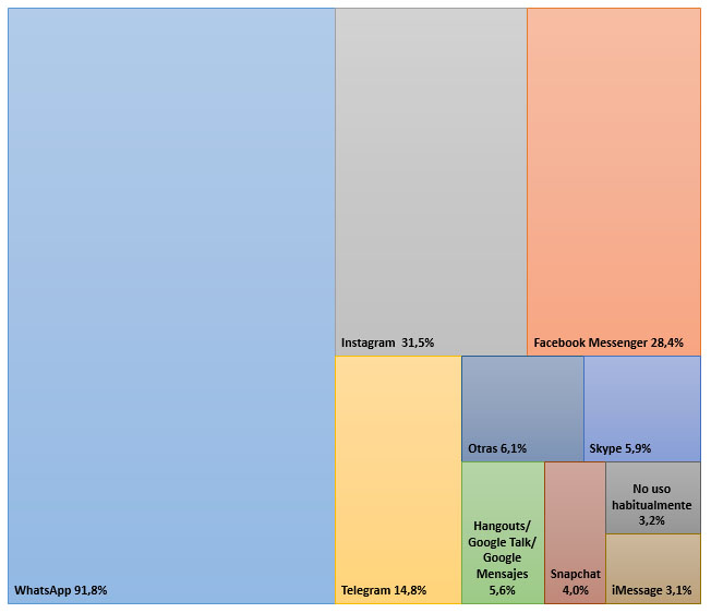El uso masivo de los smartphones conlleva la utilización de determinadas apps. Por ejemplo, la mensajería online, en donde WhatsApp sigue siendo el líder indiscutible, seguido de Instagram y Facebook Messenger (los tres, con el mismo propietario):