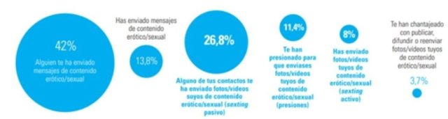 El estudio constata que casi la mitad de las y los adolescentes han recibido en alguna ocasión mensajes de contenido erótico/sexual. La práctica del sexting (envío por medios digitales de contenidos personales de carácter erótico o sexual) es cada vez más habitual siendo un 8% los que han participado alguna vez de forma activa y un 26.8% de forma pasiva.