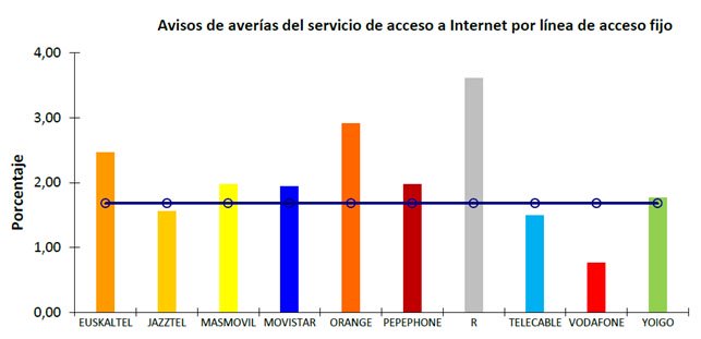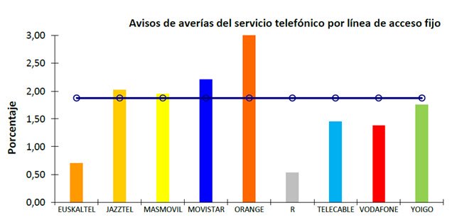 Porcentaje de avisos de avería por línea de acceso fijo del servicio telefónico fijo y servicio de acceso a Internet: Se define como la relación entre los avisos válidos de avería comunicados por los clientes residenciales sobre posibles averías en la red de acceso del operador y el número medio de líneas en servicio. El número medio de líneas en servicio es obtenido a partir de las líneas sobre las que se presta el servicio telefónico o el servicio de acceso a Internet, tanto si éste es el único servicio suministrado, como si sobre la línea se proporcionan otros servicios. Los avisos de avería contabilizados son los referidos al servicio telefónico fijo o al servicio de acceso a Internet. Su medición se realiza contabilizando todos los avisos válidos de avería recibidos durante el trimestre y el resultado se expresa como un porcentaje. Se mide y publica desagregado para el servicio telefónico fijo y para el servicio de acceso a Internet fijo.