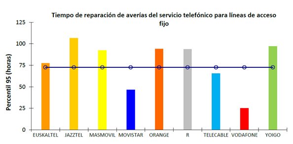 Tiempo de reparación de averías para líneas de acceso fijo del servicio telefónico fijo y servicio de acceso a Internet: Se define como el tiempo transcurrido desde el instante en el que se ha notificado por el cliente un aviso de avería hasta el momento en que el elemento del servicio, o servicios, se ha restablecido a su normal funcionamiento. Se contemplan las siguientes mediciones: