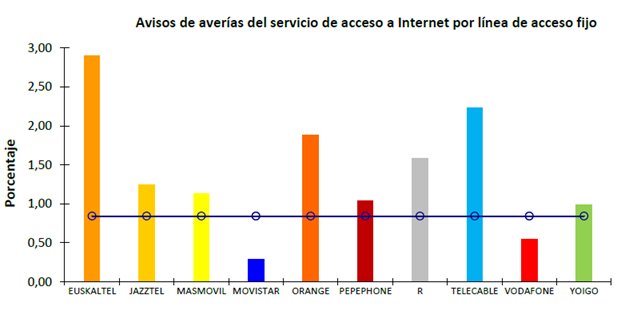 Porcentaje de avisos de avería por línea de acceso fijo del servicio telefónico fijo y servicio de acceso a Internet: Se define como la relación entre los avisos válidos de avería comunicados por los clientes residenciales sobre posibles averías en la red de acceso del operador y el número medio de líneas en servicio. El número medio de líneas en servicio es obtenido a partir de las líneas sobre las que se presta el servicio telefónico o el servicio de acceso a Internet, tanto si éste es el único servicio suministrado, como si sobre la línea se proporcionan otros servicios. Los avisos de avería contabilizados son los referidos al servicio telefónico fijo o al servicio de acceso a Internet. Su medición se realiza contabilizando todos los avisos válidos de avería recibidos durante el trimestre y el resultado se expresa como un porcentaje. Se mide y publica desagregado para el servicio telefónico fijo y para el servicio de acceso a Internet fijo.