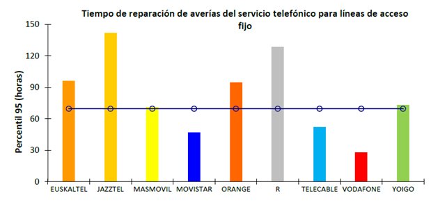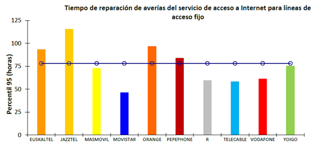 Tiempo de reparación de averías para líneas de acceso fijo del servicio telefónico fijo y servicio de acceso a Internet: Se define como el tiempo transcurrido desde el instante en el que se ha notificado por el cliente un aviso de avería hasta el momento en que el elemento del servicio, o servicios, se ha restablecido a su normal funcionamiento. Se contemplan las siguientes mediciones: