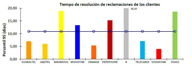 Tiempo de resolución de reclamaciones de los clientes: Se define como el tiempo transcurrido entre la presentación por parte de un cliente residencial de una reclamación relativa al servicio telefónico y/o al servicio de acceso a Internet y la resolución por el operador de dicha reclamación. Su medición se realiza a partir de los datos de todas las reclamaciones resueltas durante el trimestre. Se ordenan de menor a mayor tiempo de resolución y se toma el registro correspondiente al 95 % de todas las reclamaciones. El valor de este registro (percentil 95) es el valor que publica el operador. Se efectúan mediciones separadas de este parámetro para el servicio fijo y el servicio móvil.